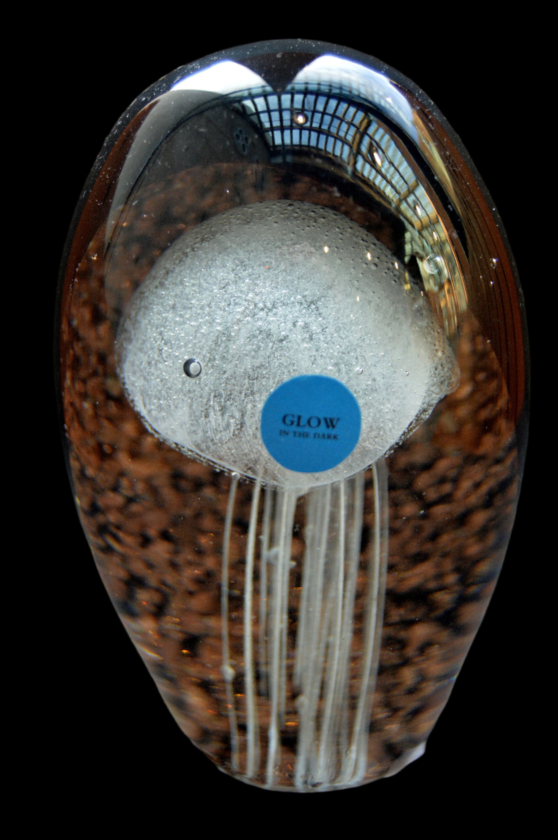 4 inch white jellyfish with black background and rose gold specks, glows in the dark